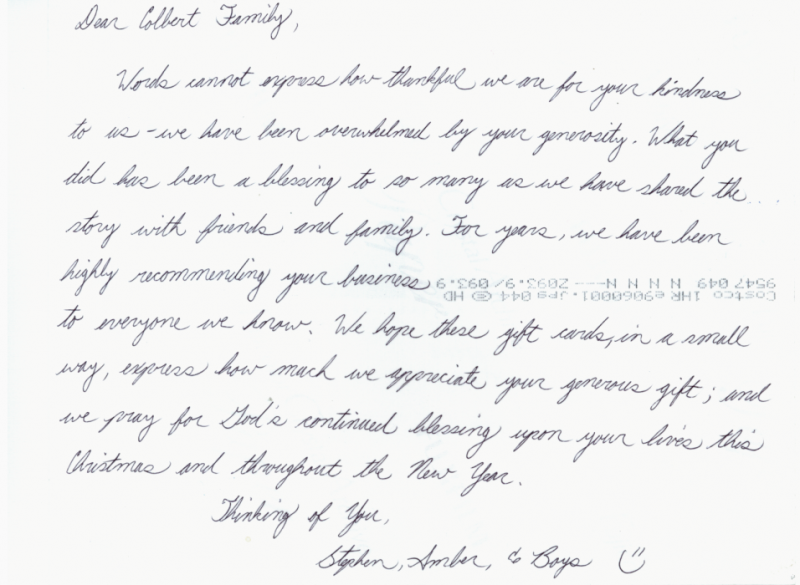 Dear Colbert Family, Words cannot express how thankful we are for your kindness to us – we have been overwhelmed