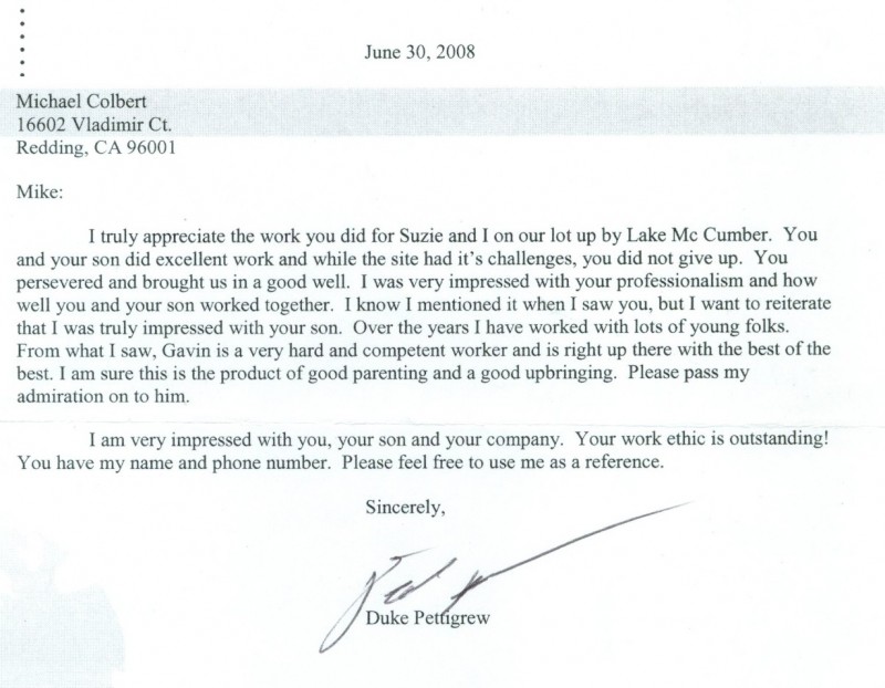 Mike:I truly appreciate the work you did for Suzie and I on our lot up by Lake McCumber. You and